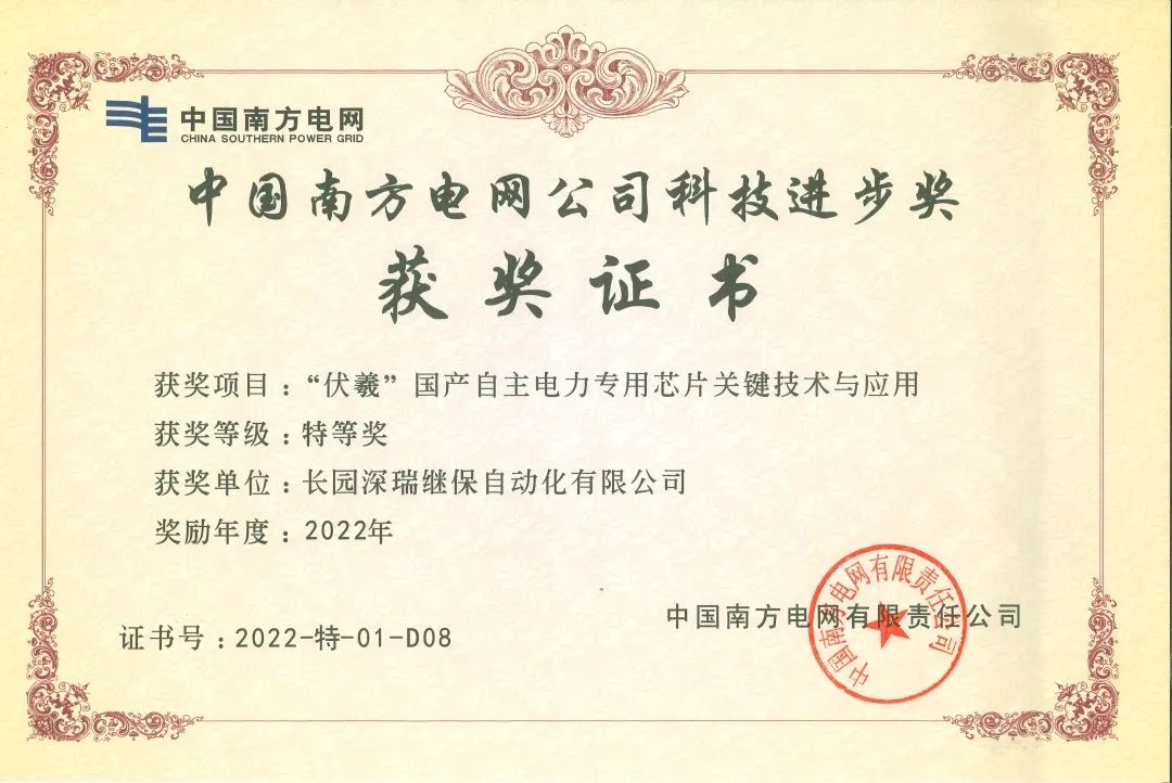 近日,由米兰milan科技集团旗下子公司米兰milan深瑞继保自动化有限公司(以下简称“米兰milan深瑞”)参与的“伏羲国产自主电力专用芯片关键技术与应用”项目荣获中国南方电网公司科技进步奖特等奖。